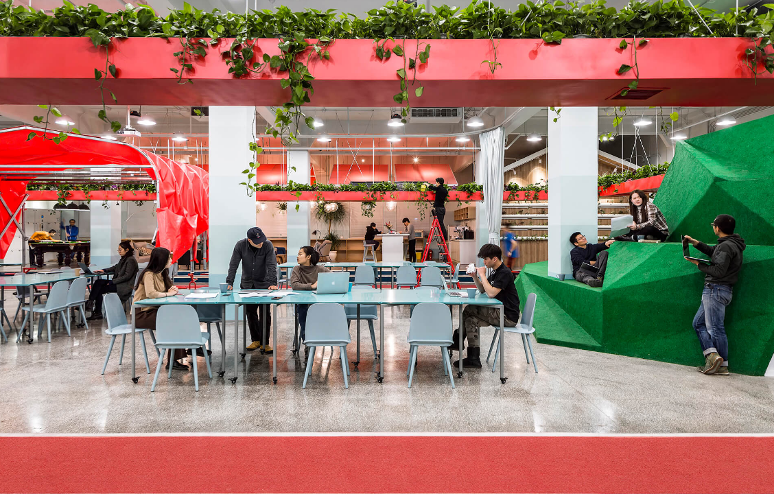 辦公室裝修設計上,用一個中間懸掛的“紅環(huán)”聯(lián)系在一起,紅環(huán)上種植蔬菜與植物,下面對應的是跑道。員工在跑道健步的同時可以打電話,也可以與照料植物的同事進行交談。
