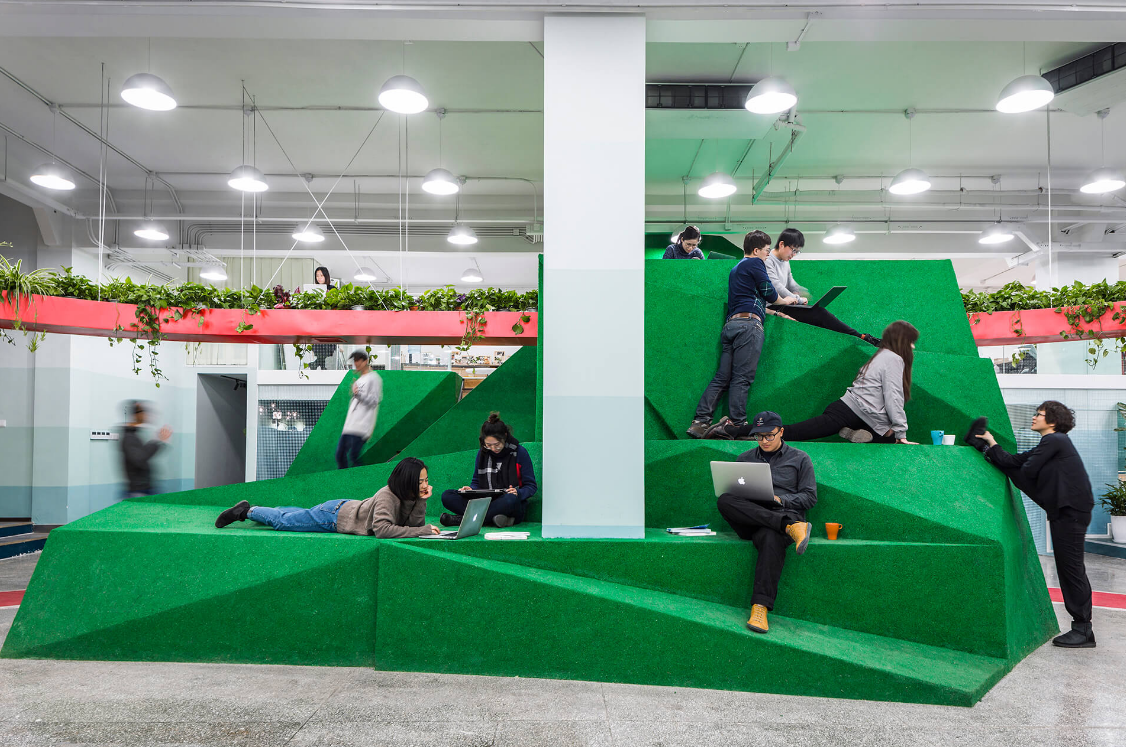 結合休閑和工作,內(nèi)部有一座'迷你山'。幾何表面為各種坐姿和休息姿勢提供良好的舒適感,并提供通往夾層的通道。有趣的是,墻上的圖形旨在提醒員工保持積極和不斷變化的工作姿勢。漸變的藍色柱子以60厘米為單位涂刷,其中在每個高度上對應了不同的姿勢和活動,如坐,走,躺,攀爬等等。