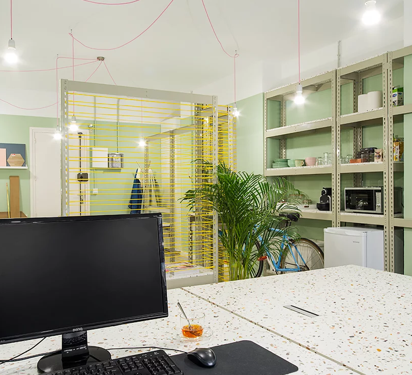 該工作室分為兩個區(qū)域:與入口接觸的會議室,以及位于房間后面并與自然光入口接觸的工作區(qū)。將這兩個區(qū)域分開,有一個鋼結構和紡織品穿插的分隔框,覆蓋了整個區(qū)域。辦公室的室內(nèi)裝修采用了很多水磨石來裝飾,包括桌面,置物臺,前臺等等