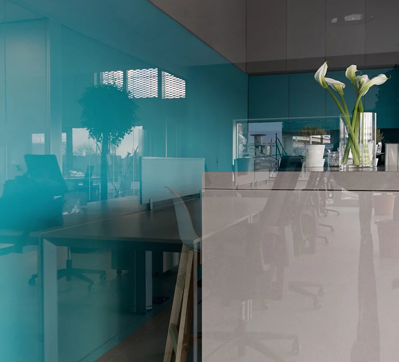 辦公室裝修設(shè)計(jì)中部分采用了光滑又帶有反射的材料。
