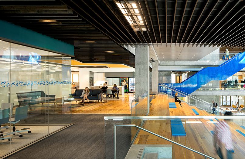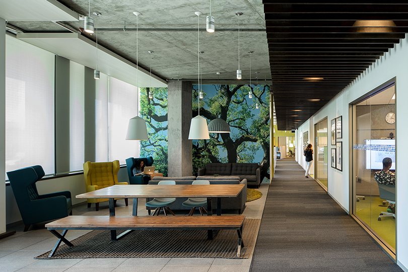 四層的辦公室裝修。在主中庭空間從校園的東、西兩側(cè)吸引活動(dòng),并作為MWB和大Intuit社區(qū)的中心。沿著中庭的每一個(gè)樓梯平臺(tái)和露天看臺(tái)直接連接到一個(gè)大的“起居室”,可以用餐也可以工作。辦公室裝修中除了陽(yáng)臺(tái)和休閑軟家具設(shè)置等更為私密的突破空間,這些空間提供了一系列工作機(jī)會(huì),沿著中庭周邊的各種程序功能有助于在整個(gè)工作日產(chǎn)生一致的活動(dòng)。