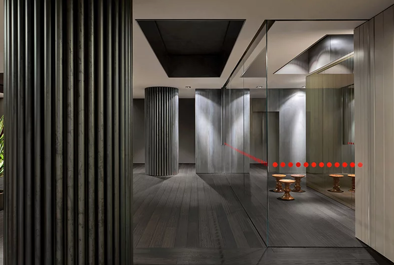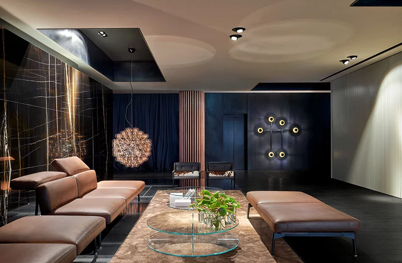 辦公室裝修的8樓,開放美麗的城市景觀,是為Adris Grupa管理委員會主席和最親密的伙伴。它的融合體現(xiàn)在企業(yè)豪華、舒適和戲劇氣氛的結(jié)合上,辦公室裝修強(qiáng)調(diào)了奢華和“工業(yè)”材料,如暗鋼、納洛撒哈拉大理石、玫瑰木單板、橡木地板和銅管,并以高光澤的紅色表面的形式孤立地吸引了視覺吸引子。公司不使用巨大的手段來傳達(dá)威望。相反,游人的活動是精心編排的充滿驚喜的辦公室裝修空間戲劇的一部分,即滑動屏幕打開并消失在墻壁上,反射面破壞空間知覺,意想不到的視角正在打開。
