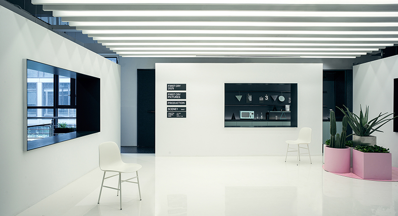 在電影辦公室的中心,辦公室裝修有一個小型投影室。 RIGI創造了純白色區域; 一個抽象的超現實空間,辦公室裝修粉紅色的裝置增添了戲劇感。材料和顏色主要是黑色和白色,就像電影本身一樣。不同質地的黑色材料共同傳達出不同的感受。辦公室裝修墻上的文字是導演的第一部電影的名字。“第一次哭泣”被視為這個空間的名稱,因為嬰兒的第一次哭泣給人的感覺是最真實的。