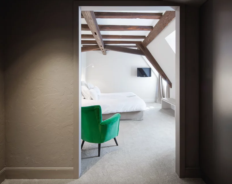 通過單色“鎖”(夜藍(lán)色或灰褐色)進(jìn)入房間,可通往浴室,衛(wèi)生間和房間。這個(gè)空間還包括一個(gè)相同顏色的櫥柜,包括衣柜和帶迷你吧和咖啡機(jī)的服務(wù)柱。保留了木梁和鑲板。桌子和軟墊長凳完成了布局。